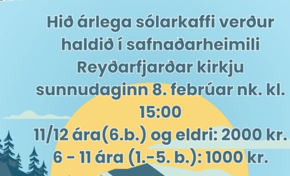 Hið árlega sólarkaffi Kvenfélags Reyðarfjarðar verður haldið sunnudaginn 8. febrúar nk. kl. 15 í Safnaðarheimili Reyðarfjarðarkirkju.
