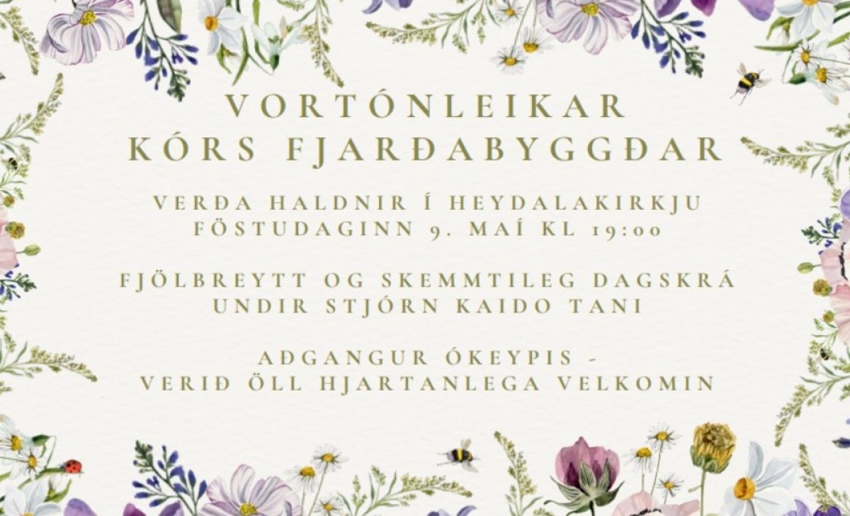 Kór Fjarðabyggðar heldur fallega vortónleika í Heydalakirkju föstudaginn 9. maí kl 19:00, undir stjórn síns snjalla stjórnanda, Kaido Tani.